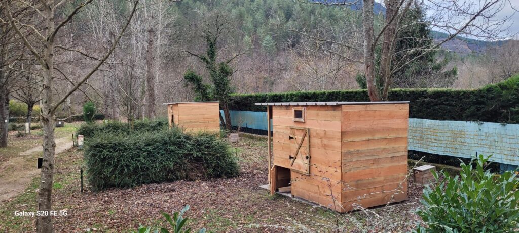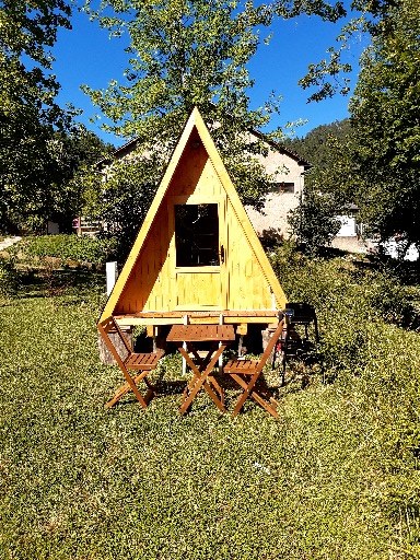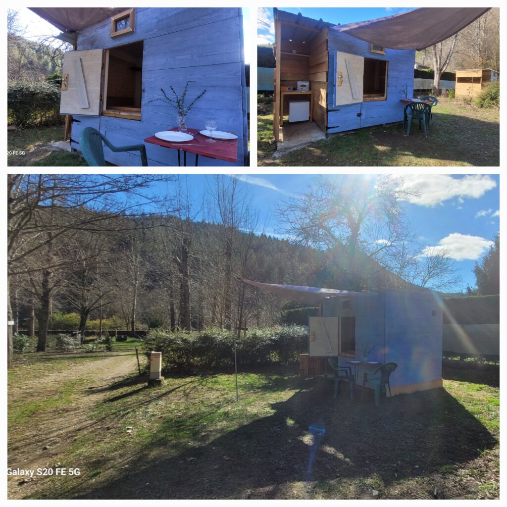 Notre tente en bois, que nous fabriquons nous-mêmes et composée à 90% de planches taillées de nos arbres, vous assure de pouvoir camper confortablement à l’intérieur (literie, électricité). A l’extérieur, il y a un barbecue électrique, ainsi qu’une table avec deux chaises (qui ne peuvent pas être amenées à l’intérieur). Un parasol est également là pour vous protéger des fortes chaleurs.