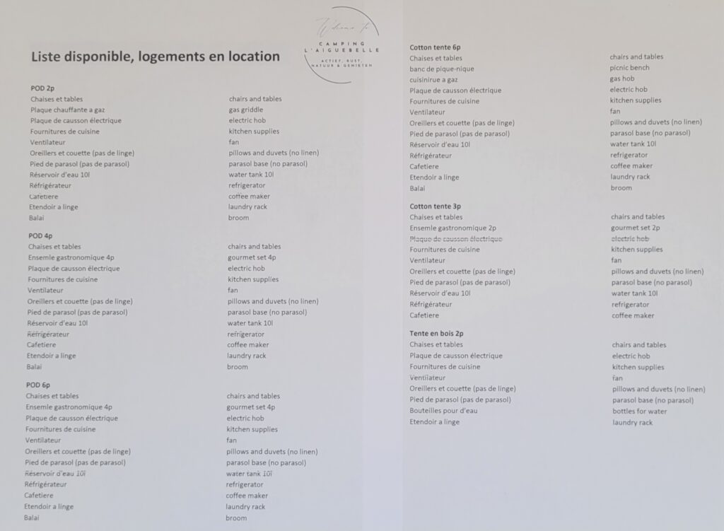 Le petit coin cuisine dispose de l’électricité et comprend un réfrigérateur, une cafetière, une cuisinière 2 feux et un jerrycan de 10 litres. Les toilettes sont les mêmes qu’au camping et l’eau est disponible aux toilettes du camping. Le service de table pour 6 personnes comprend une poêle, une casserole, une passoire et un saladier. La table centrale permet de dîner à l’intérieur à 6 personnes dans un style table basse. Les lits sont équipés de protège-matelas, de couettes d’été et d’oreillers. Deux chaises longues et une table de jardin avec 6 chaises complètent l’extérieur de la tente.